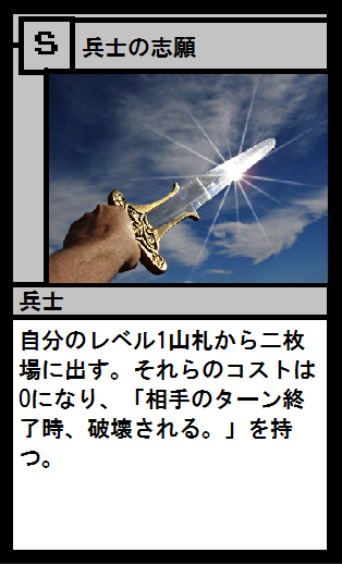 自分のレベル1山札から2枚場に出す。それらのコストは0になり、「相手のターン終了時、破壊される。」を持つ。